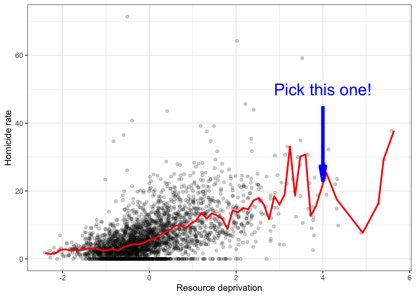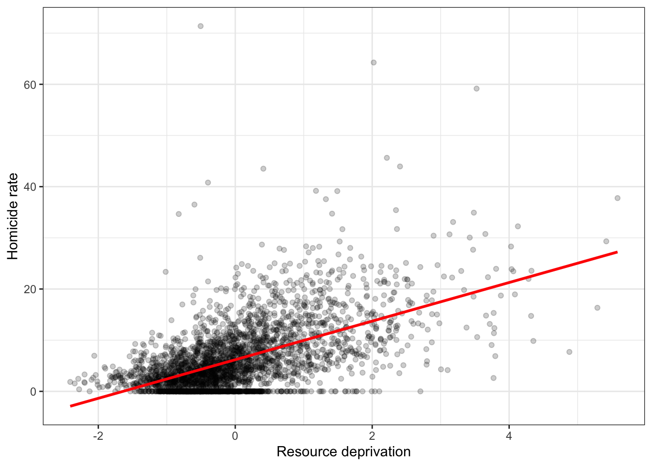 Our regression line underpredicts at low levels of resource deprivation and does not seem to capture well the variability at higher levels of resource deprivation. But imperfect as a model as it might be it simplifies well the overall growing trend for homicide as resource deprivation increases.