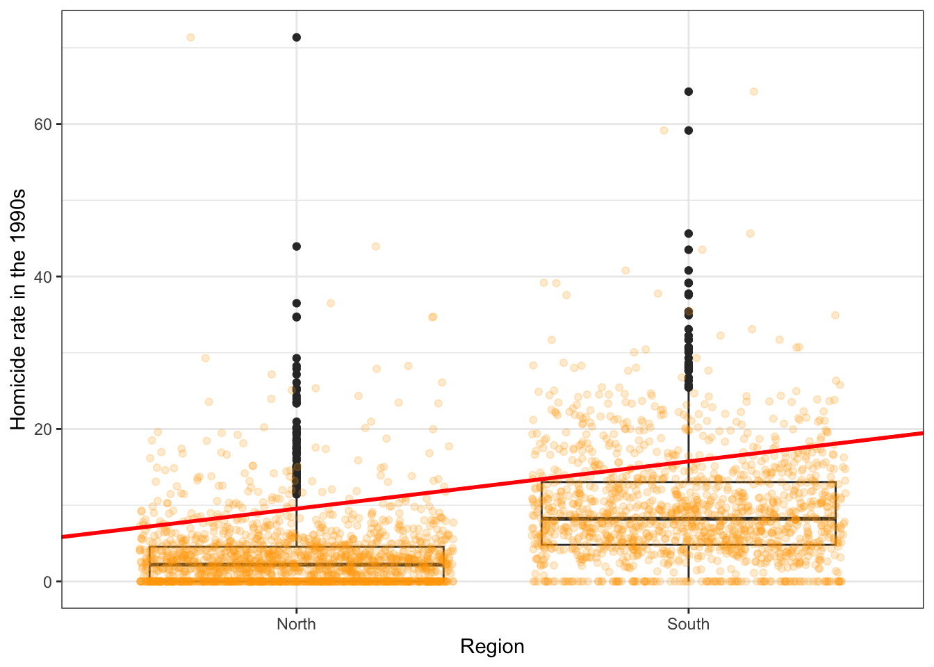 Notice that essentially what we are doing is running two regression lines and testing whether the slope is different for the two groups. The intercept is different, we know that Southern counties are more violent, but what we are testing here is whether the level of homicide goes up in a steeper fashion (and in the same direction) for one or the other group as the level of resource deprivation goes up. We see that’s the case here. The estimated lines are almost parallel, but the slope is a bit more steep in the Southern counties. In southern counties, resource deprivation seems to have more of an impact on homicide than in northern counties.