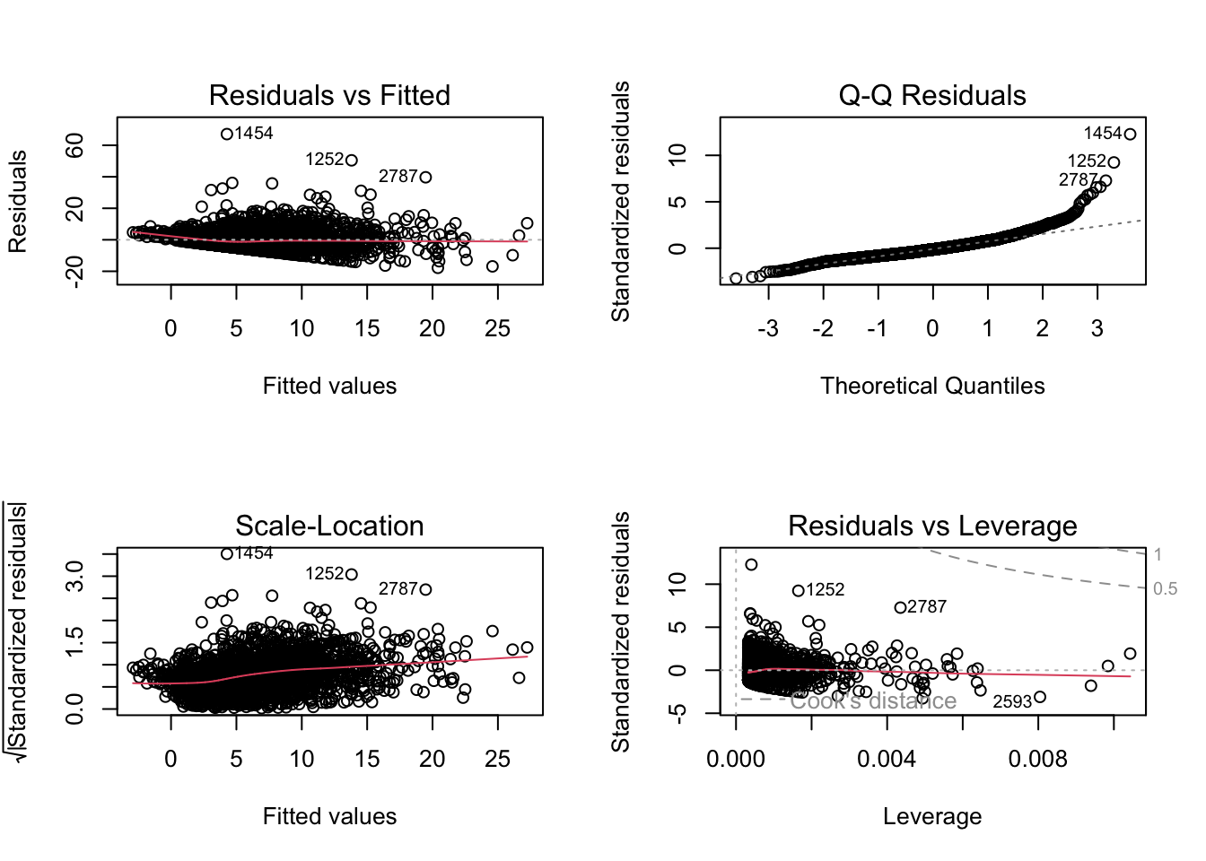 In r, we can use the plot() function on our output lm object to look through some diagnostics. This gives us 4 plots, so to show them all, we’ll use the code par(mfrow = c(2, 2)) to split our plot window into 4 panes (remember to set back, run par(mfrow = c(1, 1))). For example, let’s return to fit_1, our very first model.